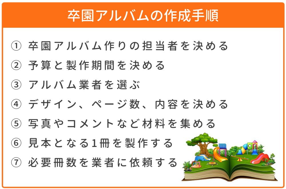卒園アルバムを保護者が作る場合には、上記画像にある1~7の手順を踏むと良いでしょう。3で「アルバム業者を選ぶ」とあるように、手作りをする場合にも印刷や製本は業者に依頼するのが一般的です。