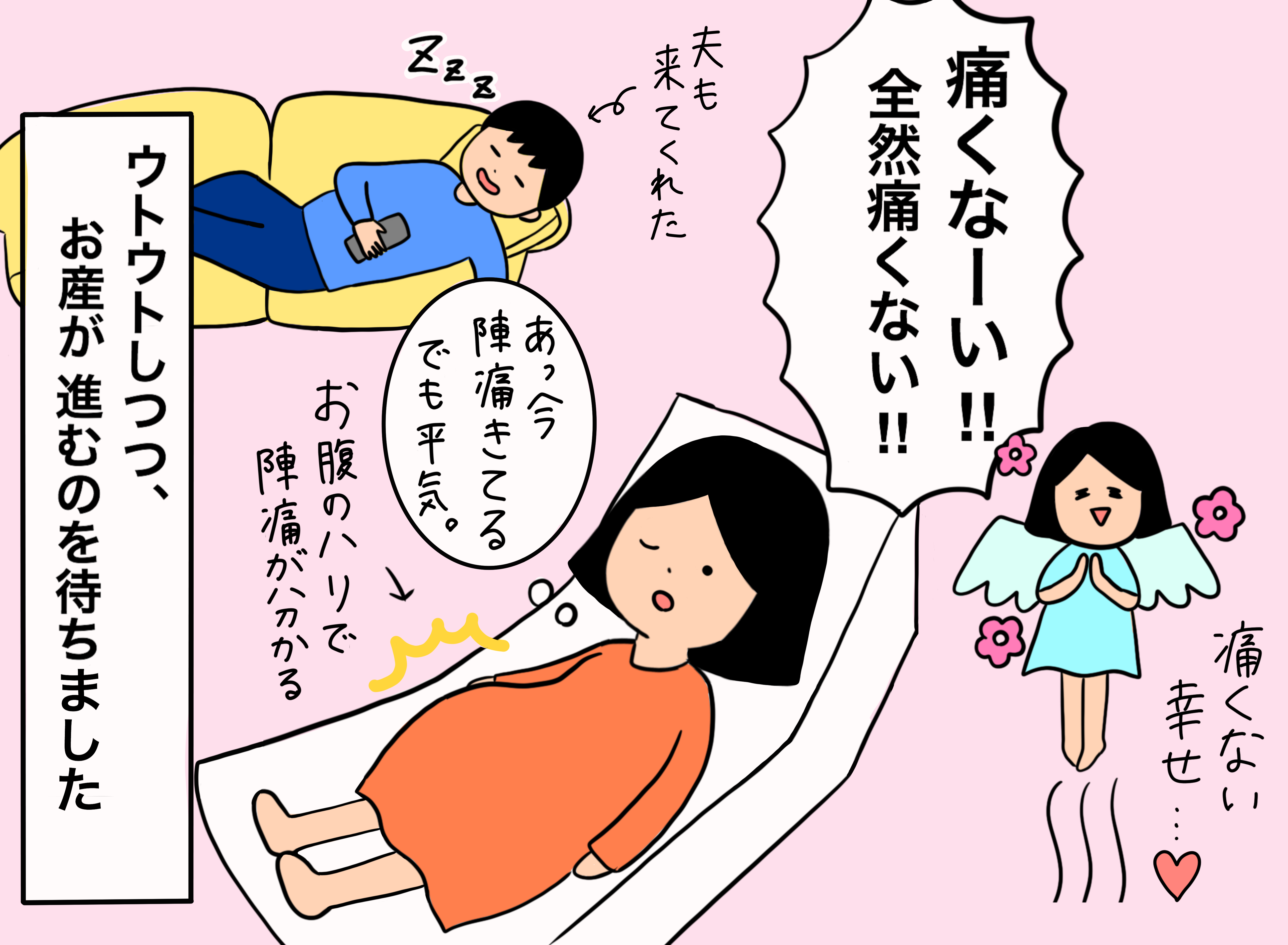 筆者の場合、なかなか子宮口が全開にならず途中から陣痛促進剤が使用されました。すると、薬の効果かお産が瞬く間に進み、同時に強い痛みがやってきました。痛みが強いことを先生に伝えると、麻酔を背中から入れてもらえます。この1回の麻酔の注入で、だいたい1時間半~2時間ほど麻酔がきく感じでしょうか。