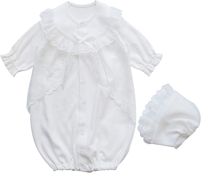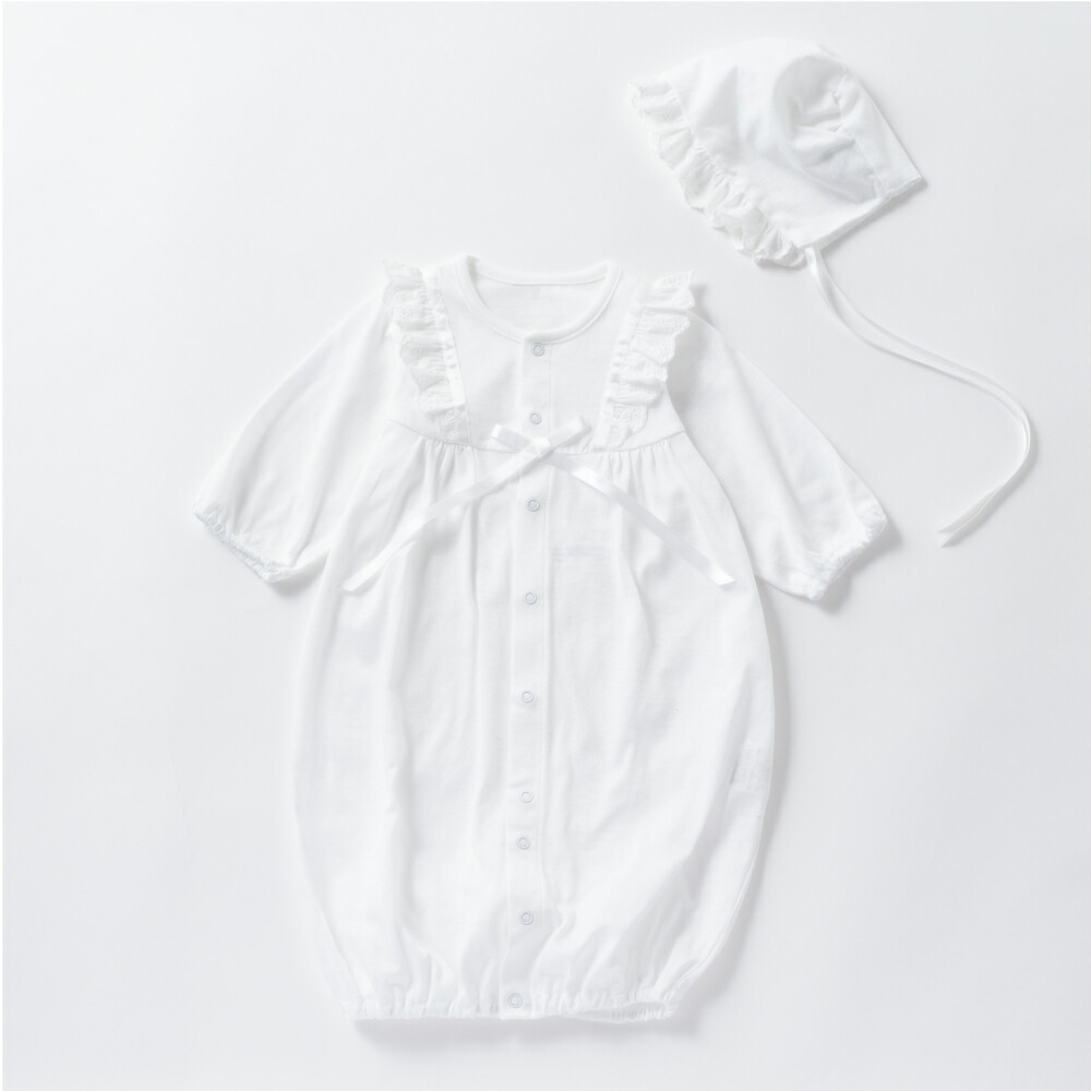短めのAラインレースが素敵な日本製のセレモニードレスです。裾が大きく開くので、おむつ交換が楽に行えます。裾にはスナップが付いているので、ドレス部分がまくれ上がることなく赤ちゃんを抱っこできますよ。セットのフードは、デリケートな赤ちゃんの肌に優しい吸水性の良いやわらかい生地です。