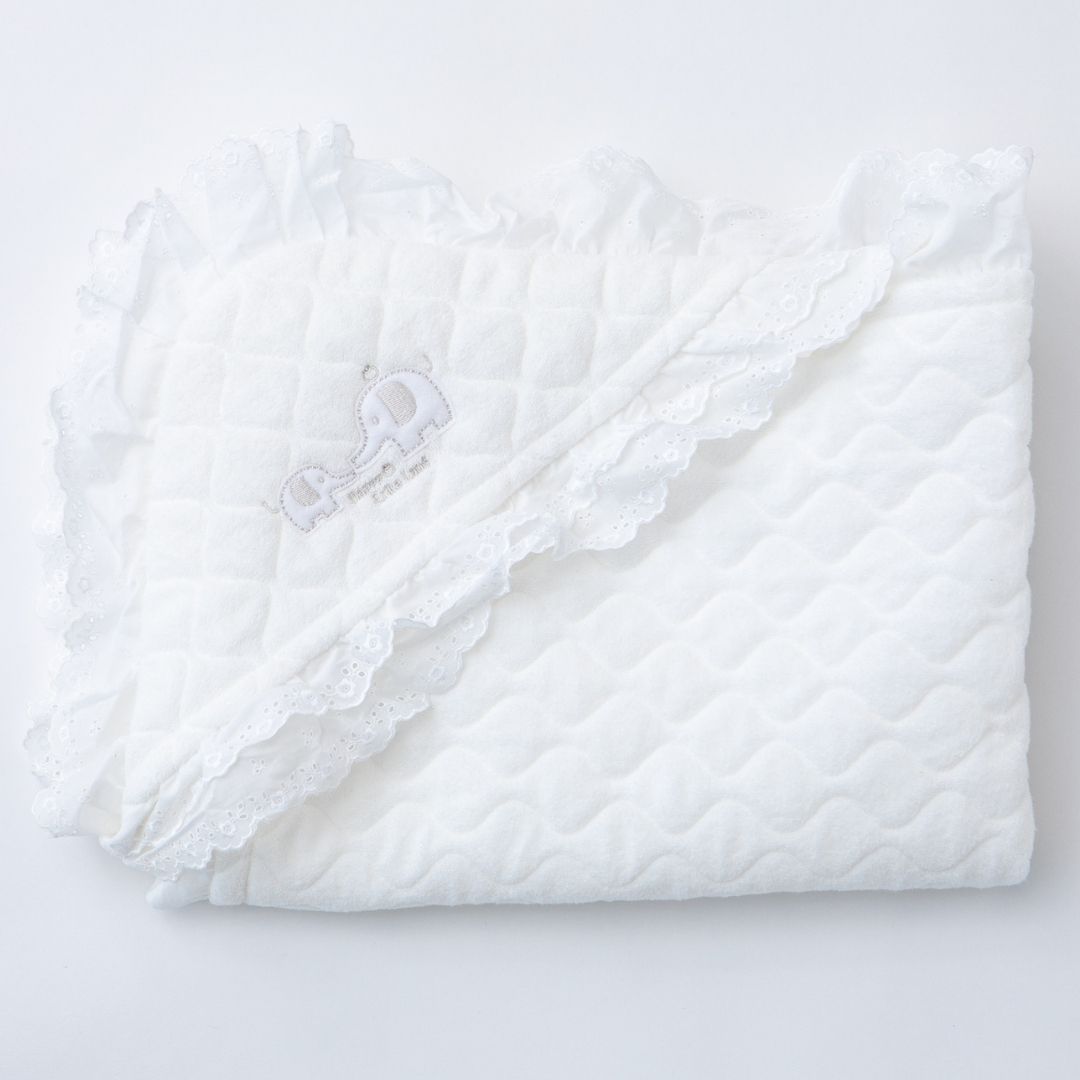 刺繍入りオーガンジーのおくるみなら、ベビードレスとも上手にコーディネートできそうですね。ふかふかの中綿入りなので、おむつ替えのときに敷いたり、寝てしまったときの布団代わりにしたりできますよ。