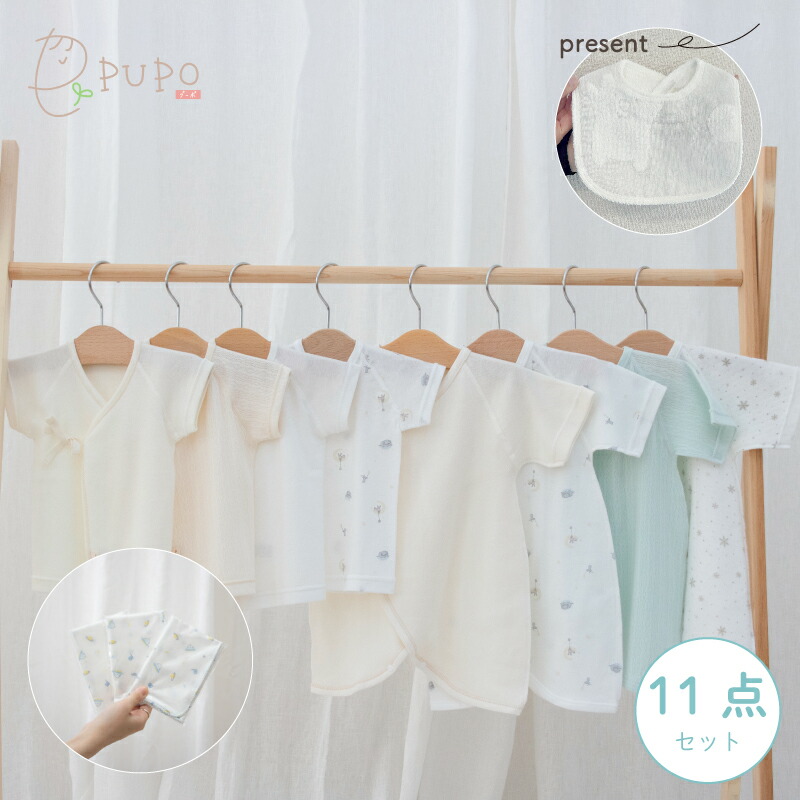 短肌着、コンビ肌着とガーゼハンカチの充実した新生児肌着11点セットです。肌着はオールシーズン使えるコーマフライスとレールメッシュが1枚ずつ、寒い季節に適したエイトロックスムース素材とニットキルト素材が1枚ずつと、季節が進んでも使いやすい素材で組み合わされています。出産準備に必要な肌着が一式揃うので、プレゼントにもおすすめですよ。