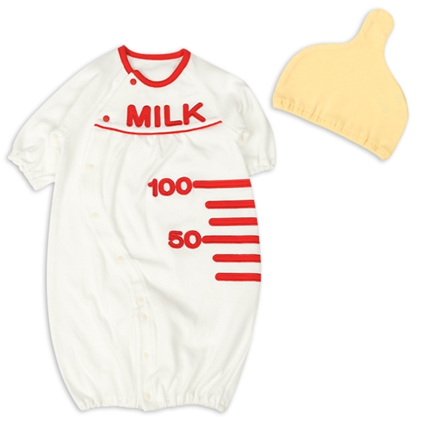 赤ちゃん本舗のツーウェイオールは、恐竜やふりーつなどの帽子がついたなりきりデザインが人気です。哺乳瓶柄が目を引く個性的なツーウェイオールは、帽子が吸い口になっています。足をバタバタ動かすようになったら、プレオールとして使用できます。