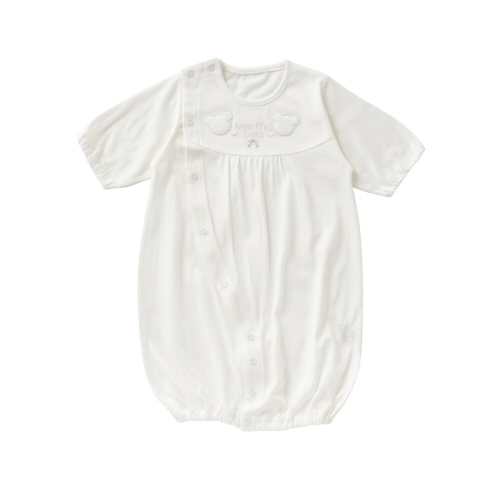 春から夏にかけて重宝する天竺素材のツーウェイオールです。七分袖なので夏でも問題なく着せることができますね。生地も縫製も安心の日本製で、デリケートな肌の赤ちゃんにも安心して着せられます。白地の上品なデザインなので、退院時に着る服としてもおすすめです。