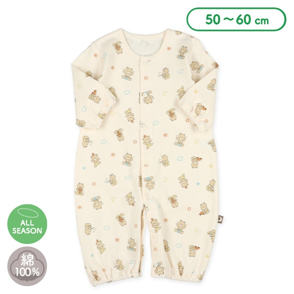 西松屋のツーウェイオールです。熊のイラストもかわいいですね。季節を問わず着せられる素材で、重宝しそうです。西松屋のツーウェイドレスには、アニマル柄、花柄、キャラクター柄、着ぐるみ風などさまざまなデザインがそろっているので、お気に入りを見つける楽しさもありますよ。