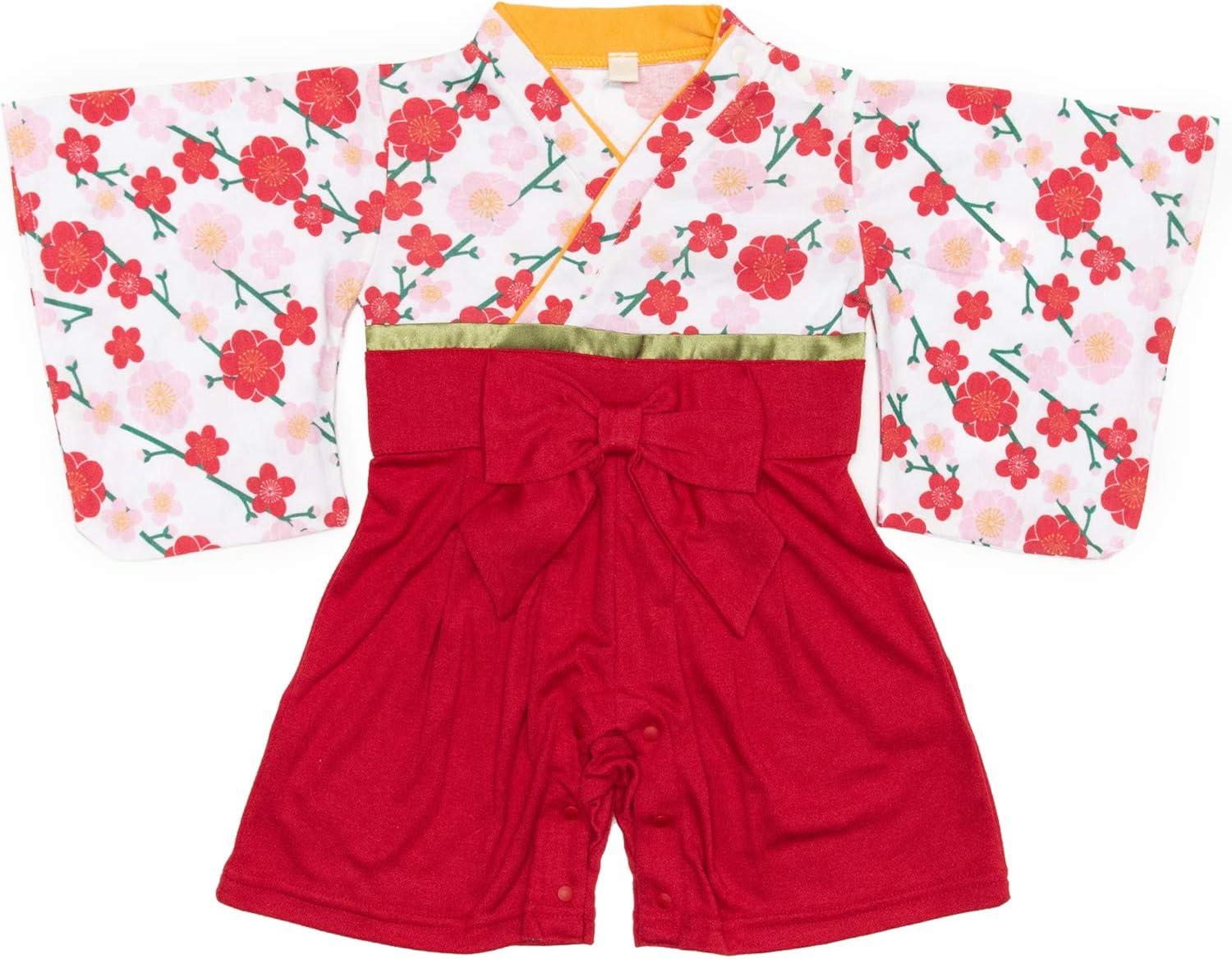 キョウエツの袴風オールです。花柄がかわいい、とてもキュートな1着です。スナップボタン付きでスムーズに着替えられますよ。ウエスト部分の大きなリボンがワンポイントです。