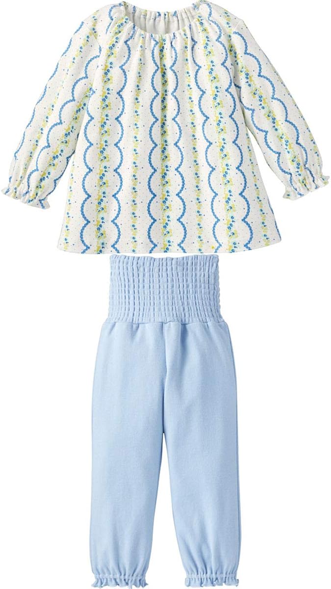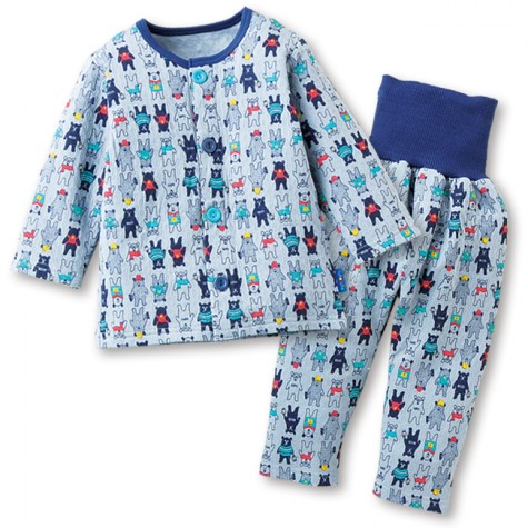 肌触り抜群の素材で作られた、腹巻付きのパジャマです。淡い色合いがおしゃれですね。パジャマのズボンの後ろにはマチがあるので、おむつをしたお尻でもゆったりはくことができます。
