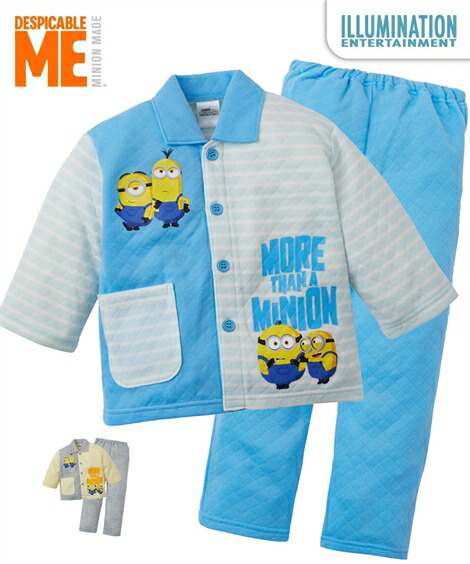 ニットキルト素材でできた、秋冬にぴったりのミニオンズのパジャマです。ニットキルト素材のパジャマは保温性に優れており、柔らかな肌触りで着心地抜群です。腹巻の付いたズボンなので、お腹も冷えにくいですね。