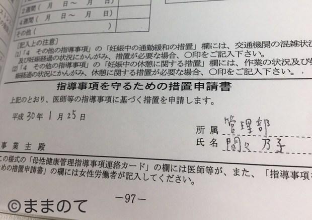 妊産婦さん自身で記入すべき箇所としては、基本的に母健連絡カード下部に記載されている「指導事項を守るための措置申請書」の部分のみです。申請日、所属、部署、氏名を記入し捺印したものを提出するようにしましょう。