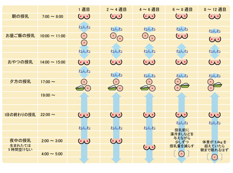 ジーナは、赤ちゃんが昼夜のリズムに慣れることが大事と考えています。そのため、昼間にたくさん栄養を摂り、夜にしっかり眠るという習慣をこのスケジュールで伝えようとしています。とはいえ、生まれたばかりの赤ちゃんは深夜も授乳が必要なので、産後の週数ごとにスケジュールは調整されています。