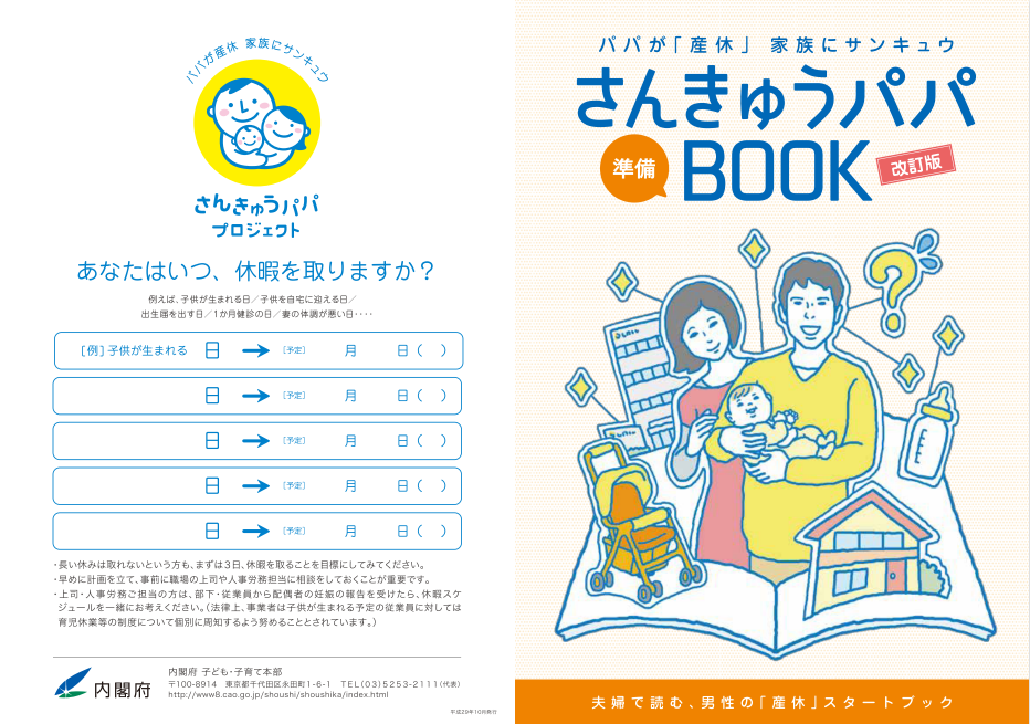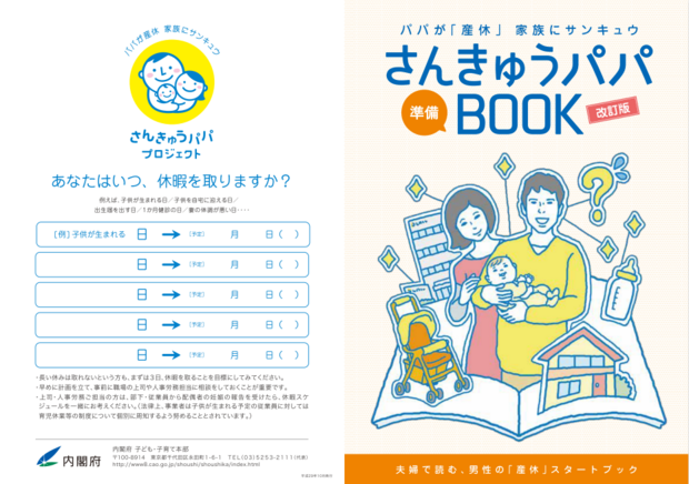 「配偶者の出産直後に男性も休暇を取ることを推進していこう」という内閣府のプロジェクトの一環で発行された、パパになる人向けの準備本です。全国共通で使用することができます。産前・産後のパパの過ごし方や子育てで使える休暇制度、実際に産後に休暇を取得したパパの体験談などが掲載されています。ママや赤ちゃんのために休暇を取りたいと考えているパパは、一度目を通してみてはいかがでしょうか。