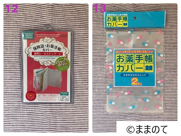 ダイソーの「保険証・お薬手帳カバー」(画像12)やキャンドゥの「お薬手帳カバー」(画像13)は、母子手帳の表紙を保護できる透明カバーです。厳密にはケースではありませんが、診察券などを収納できる切れ込みやポケットがついています。荷物をコンパクトにまとめたいママにおすすめですよ。