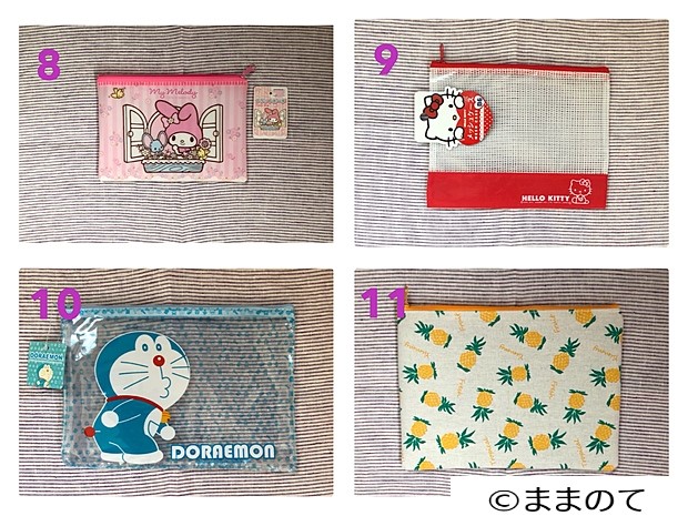 100均にはキャラものやポップな柄のポーチも豊富です。マイメロディ(画像8)はセリア、ハローキティ(画像9)はダイソー、ドラえもん(画像10)はキャンドゥで見つけました。セリアのパイナップル柄のポーチ(画像11)は裏がメッシュになっており、中身が見えて便利です。
