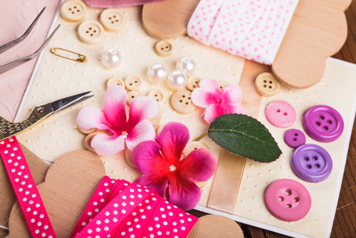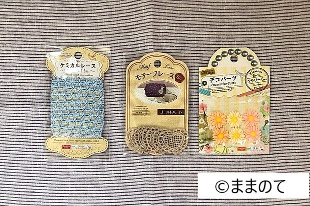 100均には手芸用品も豊富にありますから、母子手帳ケースをデコレーションして自分好みにリメイクするのもおすすめです。母子手帳ケースの好きな位置にデコパーツを接着剤で留めたり、モチーフレースを縫い付けたりするだけと簡単で、手芸が苦手なママでも挑戦しやすいのではないでしょうか。ただし、細かいパーツを子どもが誤って飲み込むことがないよう、十分注意してくださいね。