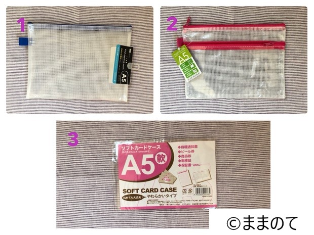 ダイソーの「ビニールネットケース」はサイズが豊富に揃っており、母子手帳や他に入れたいもののサイズに応じて選べるのがポイントです。小分け用にA6などの小さめサイズもあわせて買い、診察券といった細かいものを入れても良いでしょう。ファスナーの色も何種類かあるため、ふたり以上子どもがいても色違いで揃えられますね。