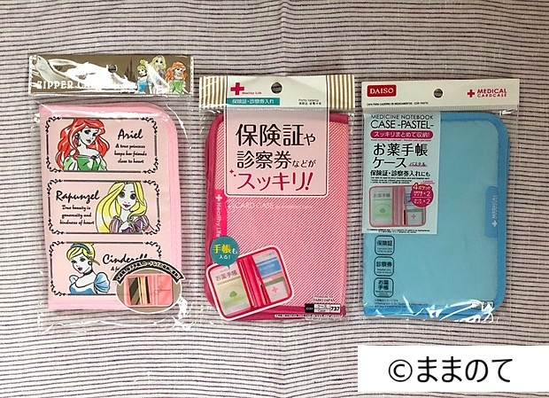 いずれも母子手帳入れにも活用できる見開きタイプのケースで、母子手帳や診察券をすっきり収納できます。ディズニープリンセスの「通帳ケース」はセリア、ピンクや水色のシンプルなケースはダイソーで販売されています。