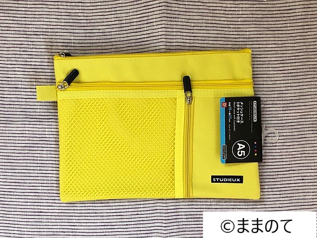 ダイソーの「マルチケース メッシュポケット付き」は収納スペースが3ヶ所あって整理がしやすいのがポイントです。色、サイズともに豊富で、子どもによって使い分けられるのも便利ですよ。