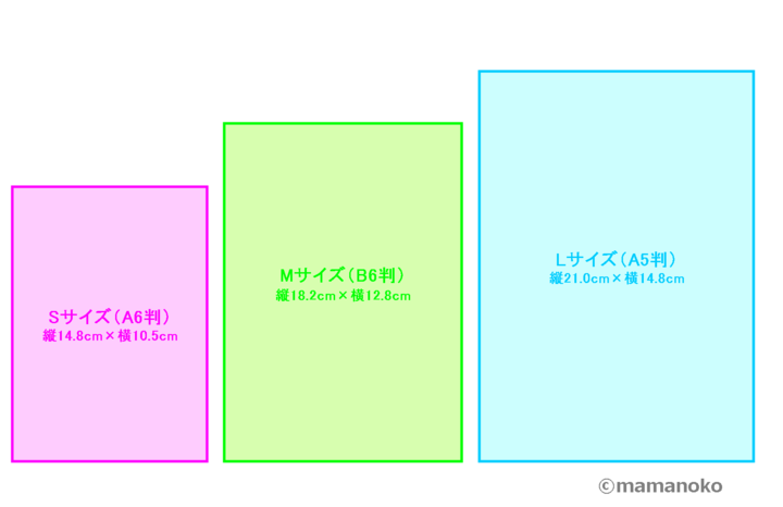 母子手帳は大きく3つのサイズに分類されます。一番小さいSサイズは、A6判で14.8×10.5cmの大きさです。MサイズはB6判で18.2×12.8cm、LサイズはA5判で21.0×14.8cmのサイズになります。