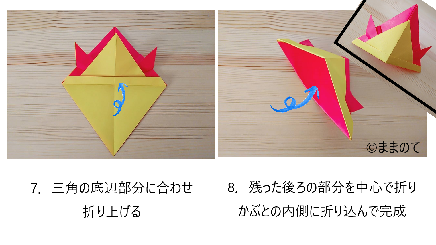 8.残った後ろの部分を中心で折り、かぶとの内側に折り込んで完成