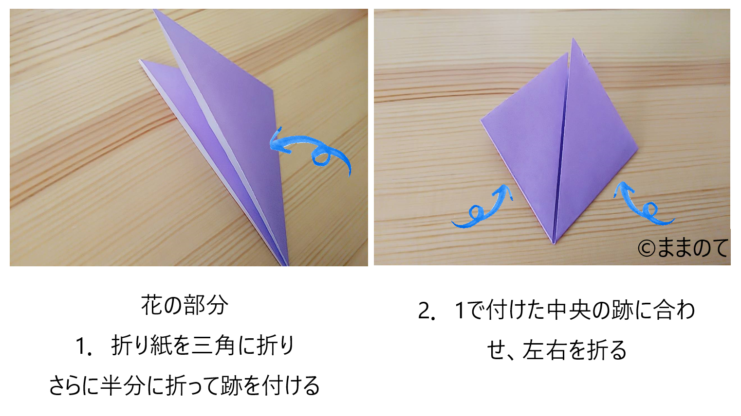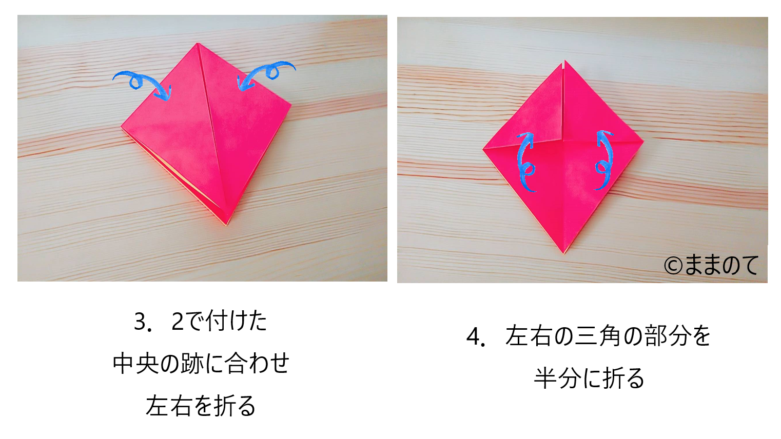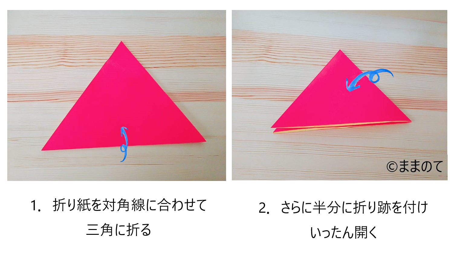 1.折り紙を三角に折り、さらに半分に折って跡を付ける