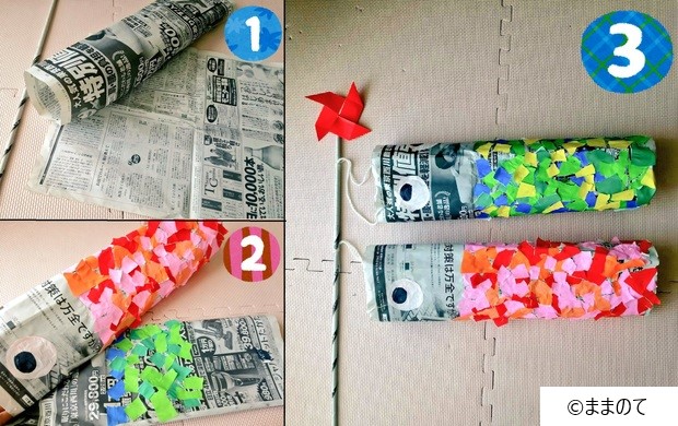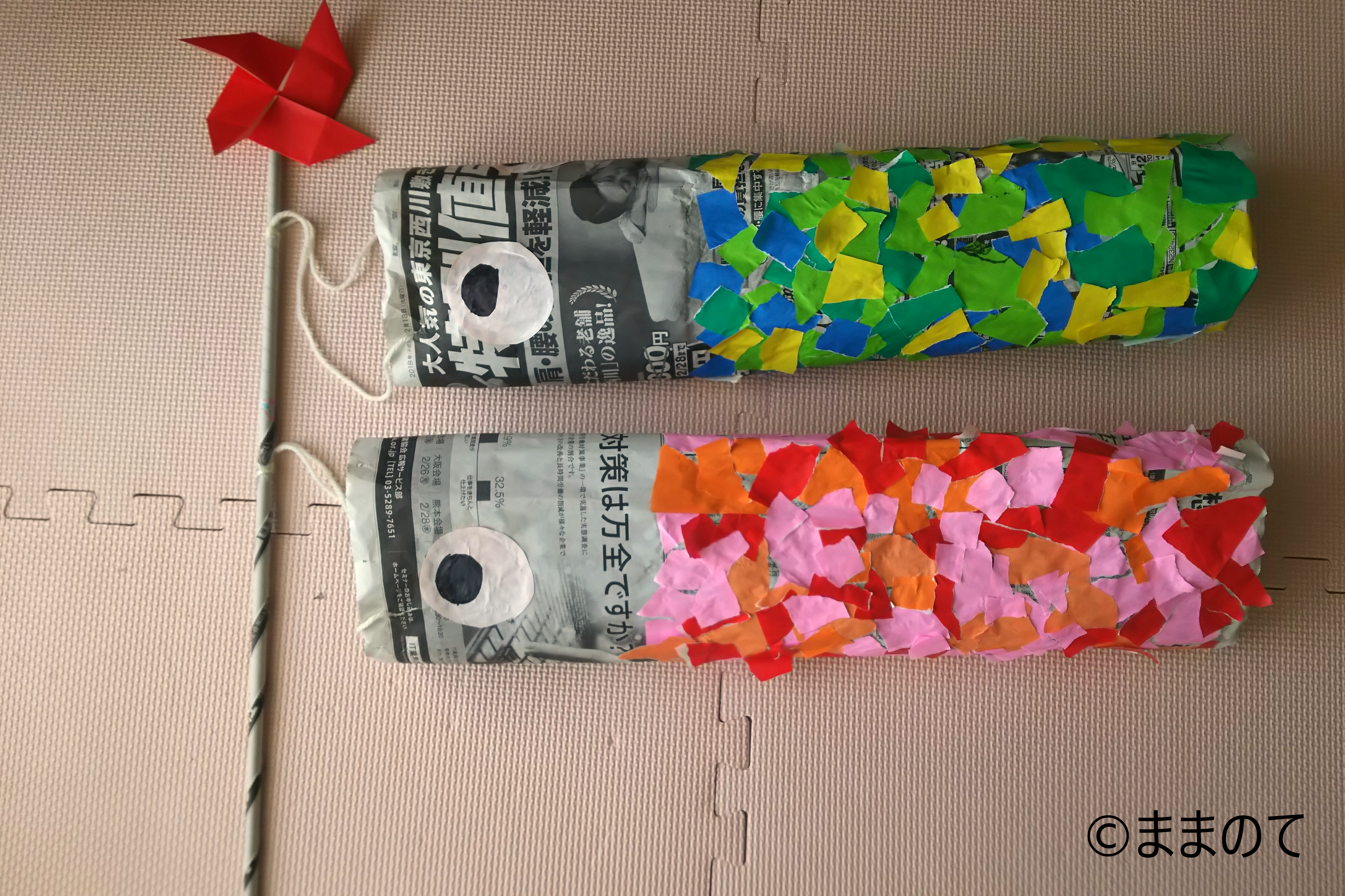 新聞紙で鯉のぼりを作る場合、新聞紙を丸めてのりで貼り付けたものに色を加えると、鮮やかな鯉のぼりになります。折り紙を手でちぎってのりで貼り付けたり、子どもの手形を押してうろこに見立てたりしても良いですね。