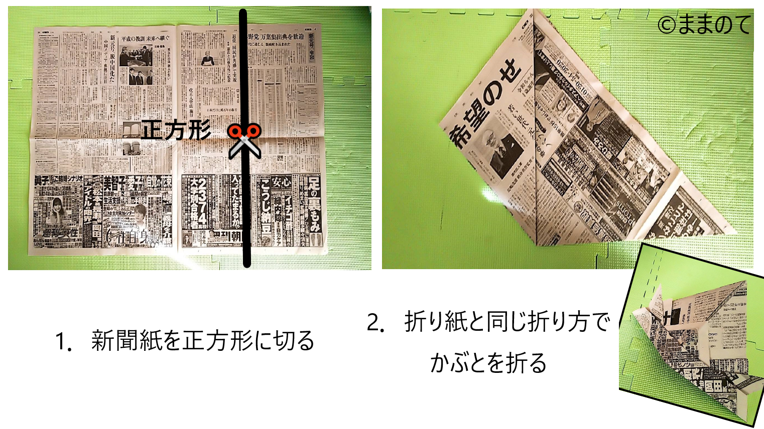 新聞紙やフェルトなど大きな素材を使用すると、スタンダードな折り方は子どもが身に着けられるかぶとを作るときも活用できますよ。