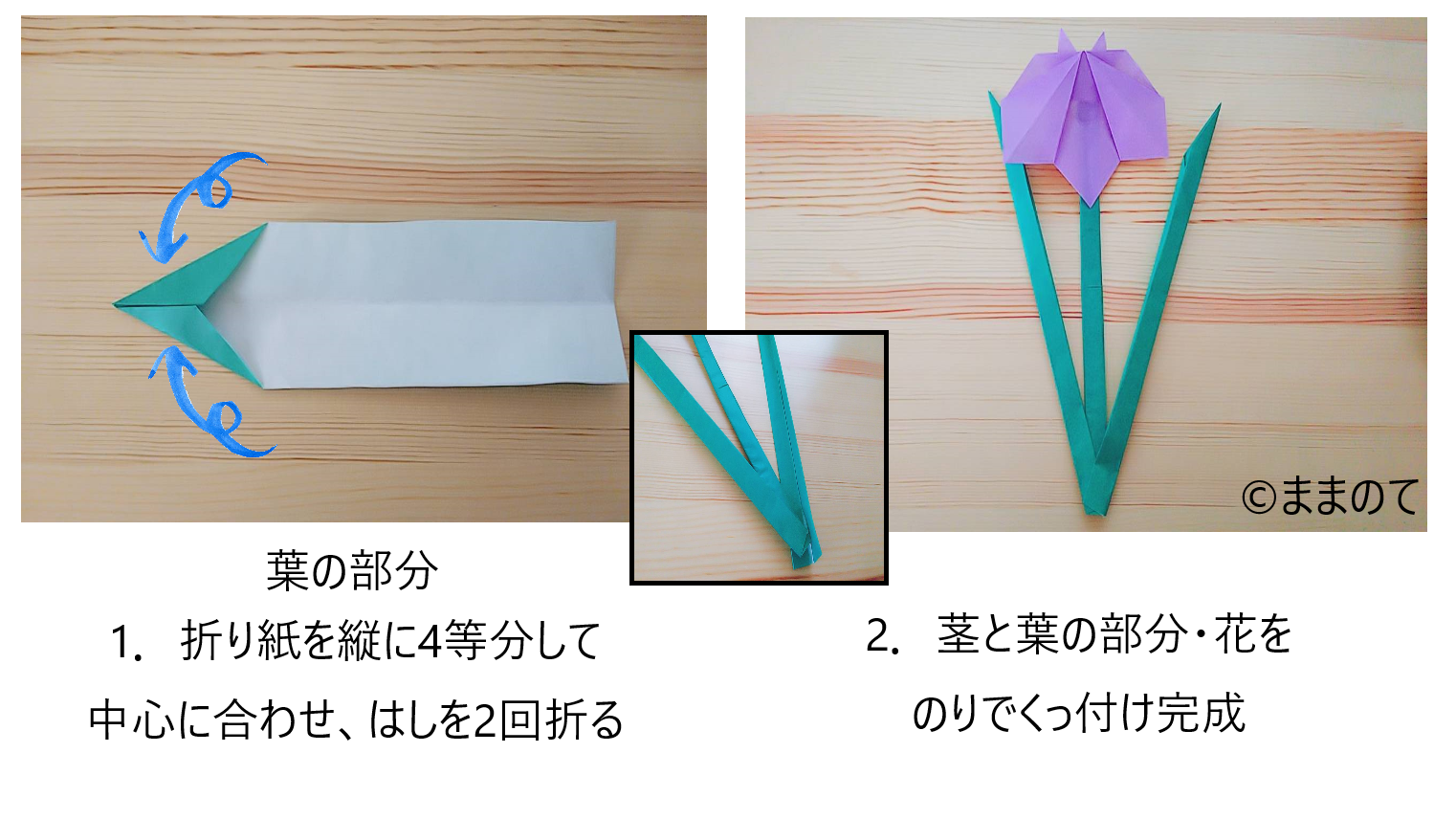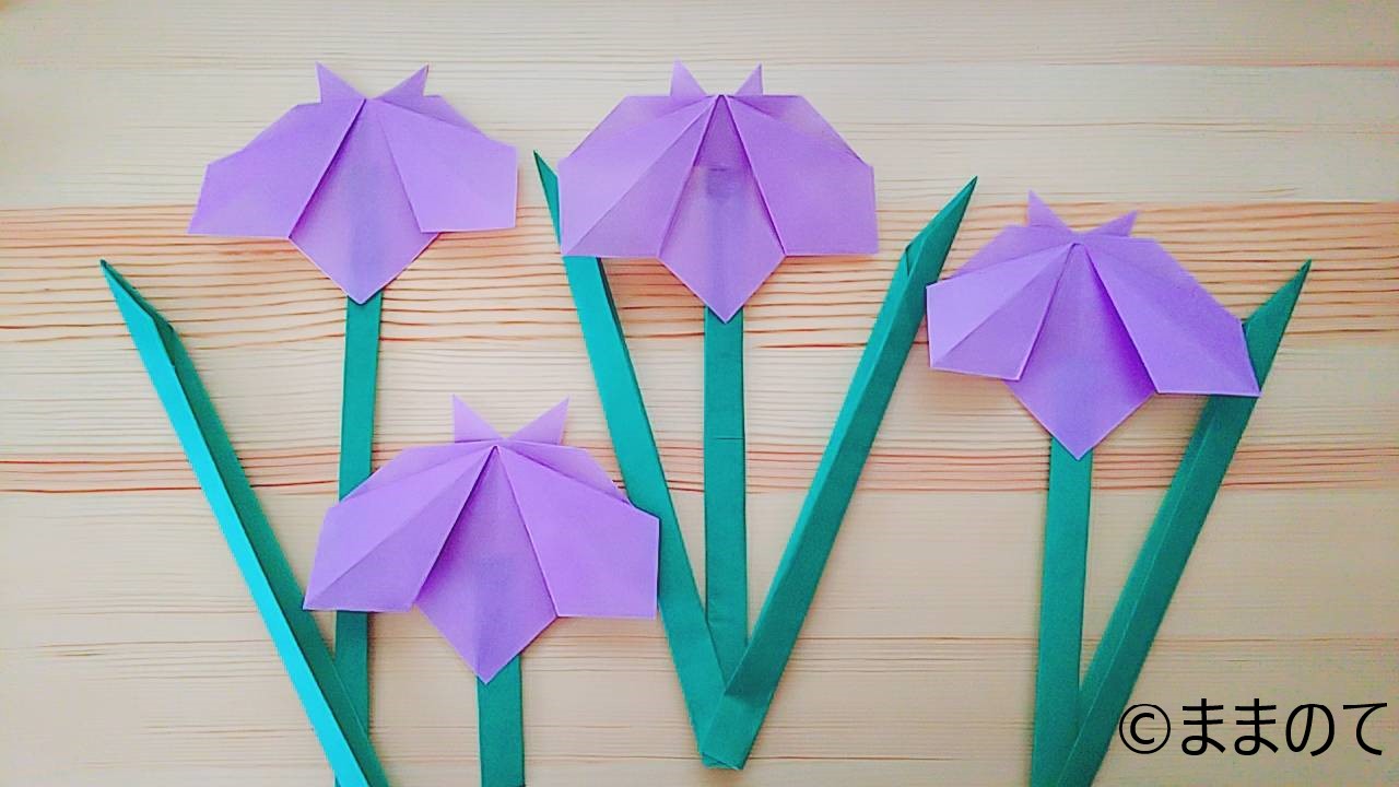 こどもの日の花として有名な花菖蒲は、折り紙で折ることができます。たくさん作った菖蒲の花を画用紙などに貼って、タペストリーのように壁に飾っても良いですね。