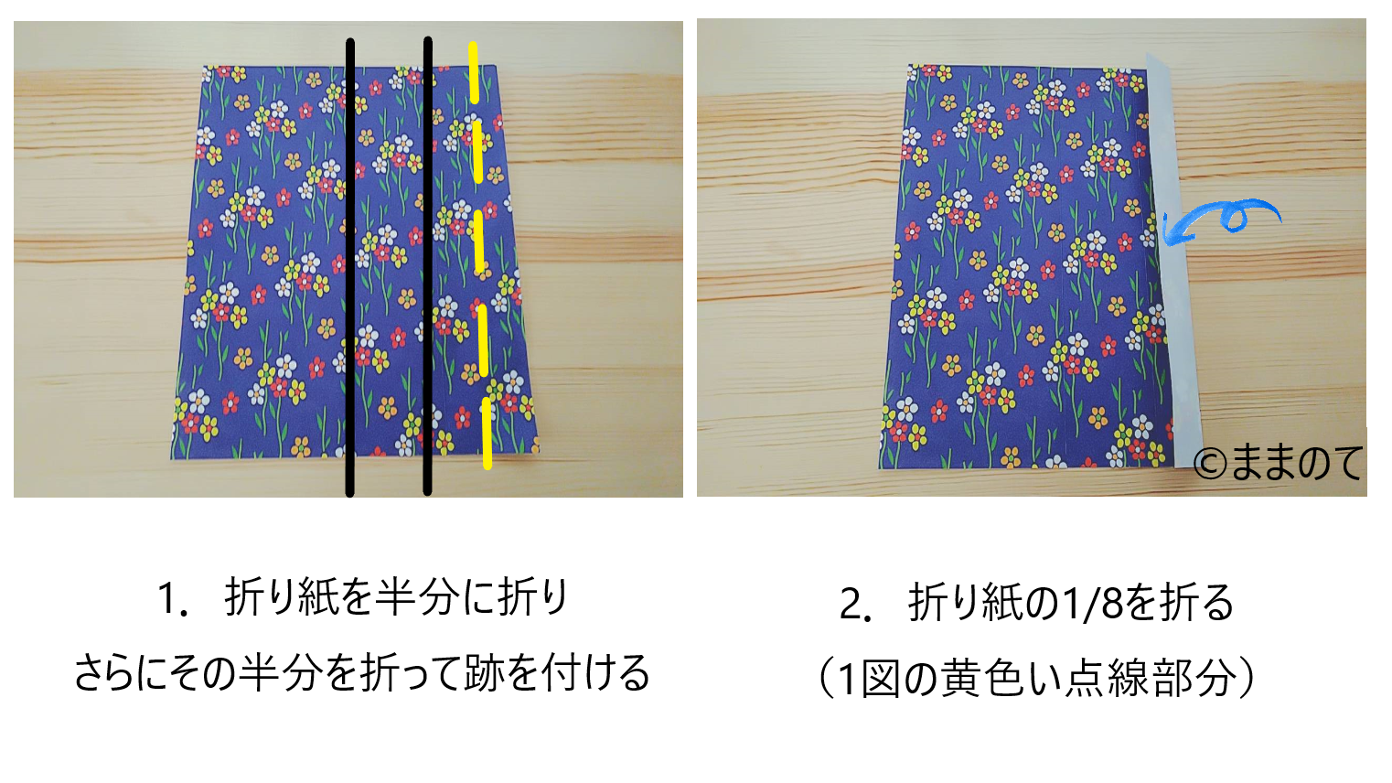 1.折り紙を半分に折り、さらにその半分を折って跡を付ける