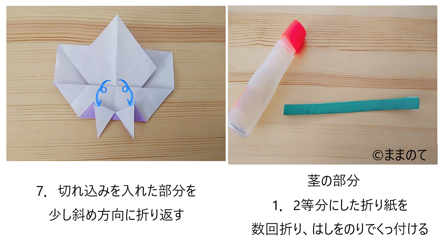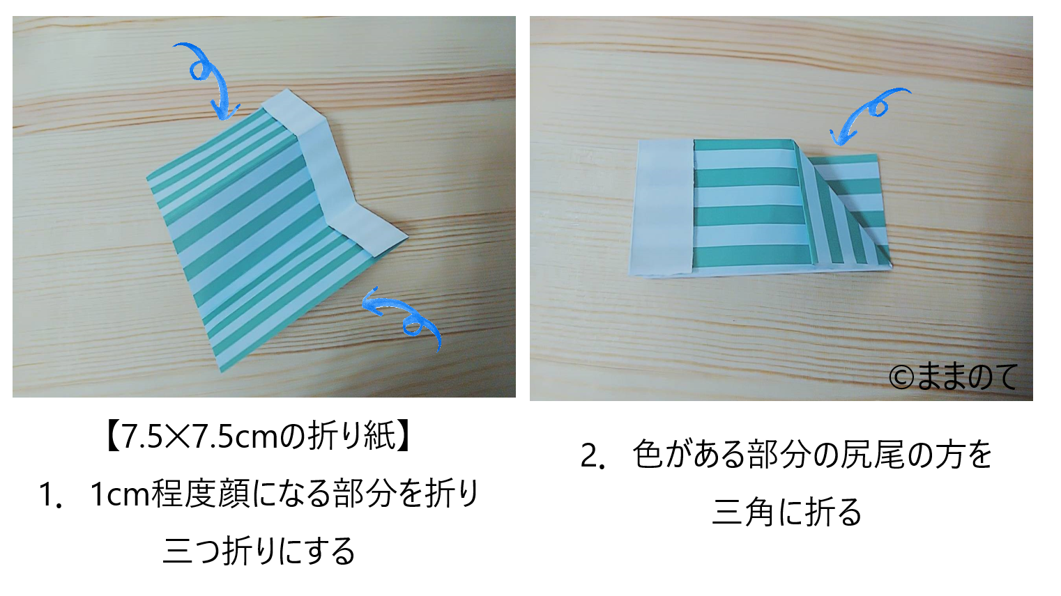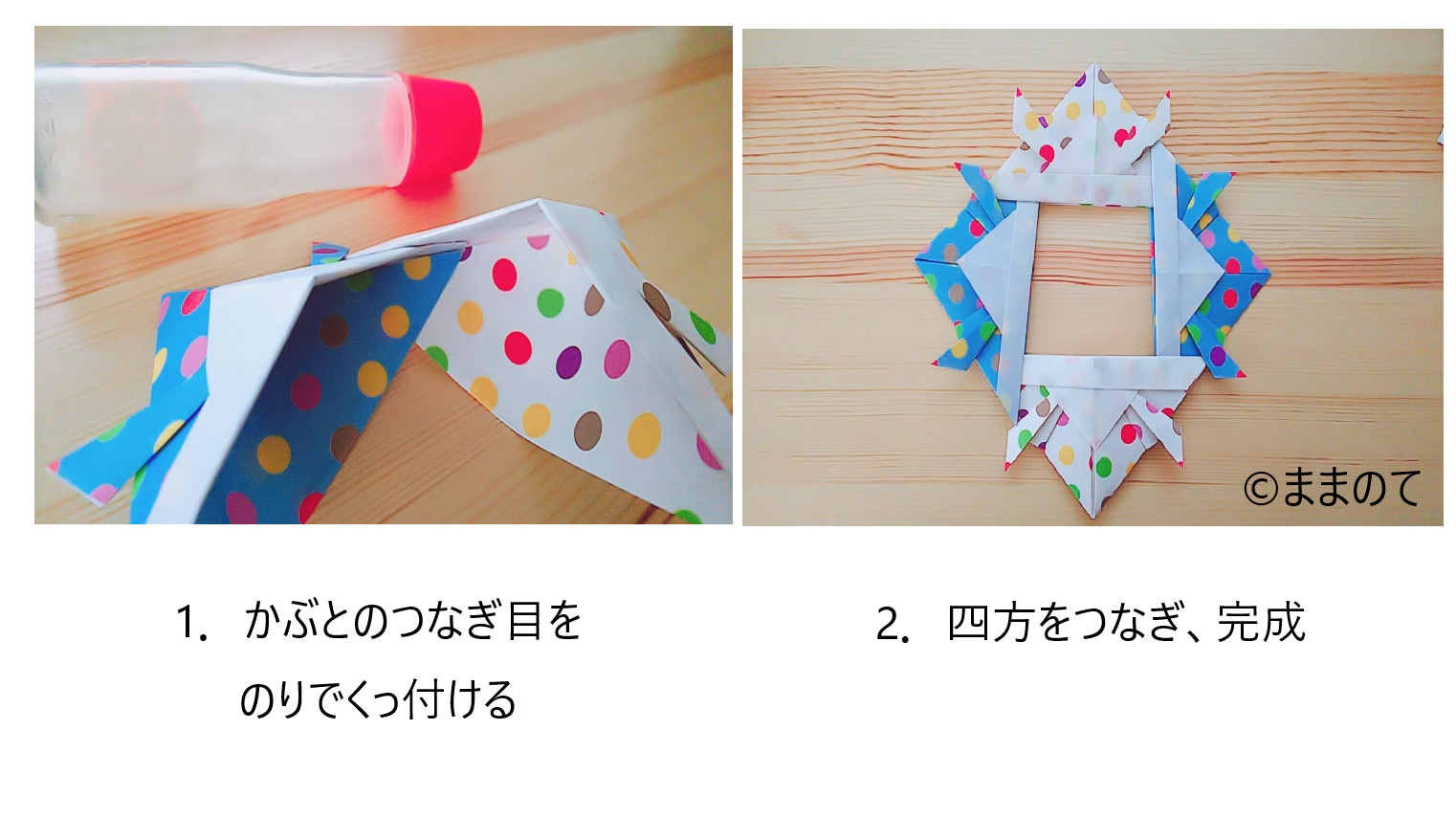 1.2等分にした折り紙を数回折り、はしをのりでくっ付ける