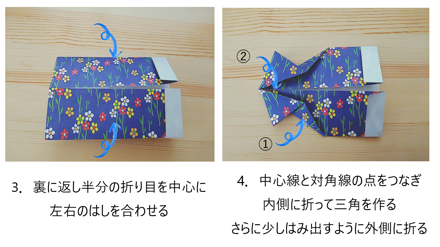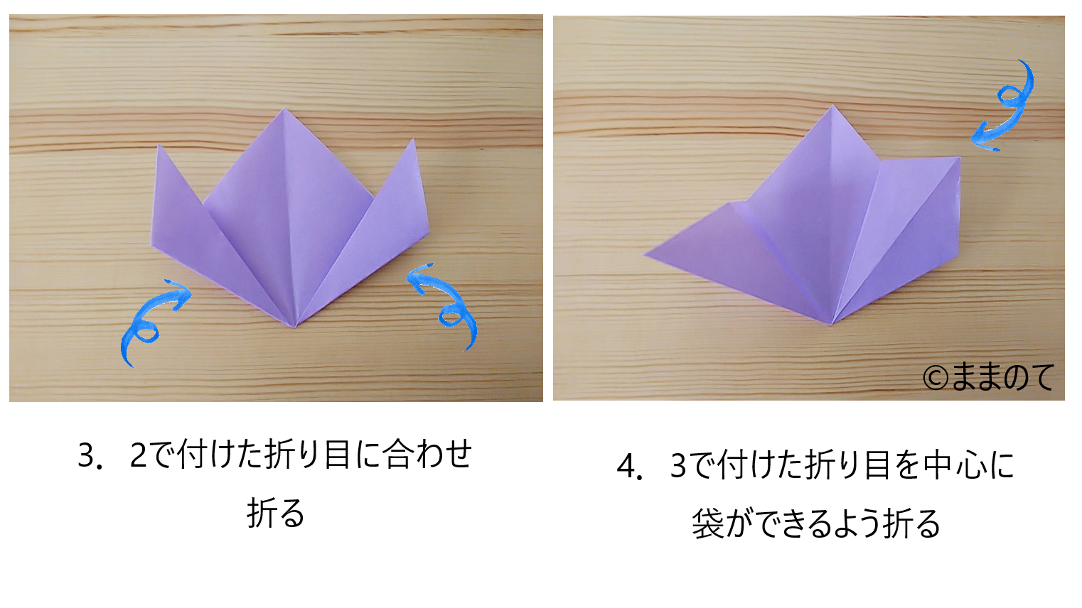 4.3で付けた折り目を中心に、袋ができるよう折る