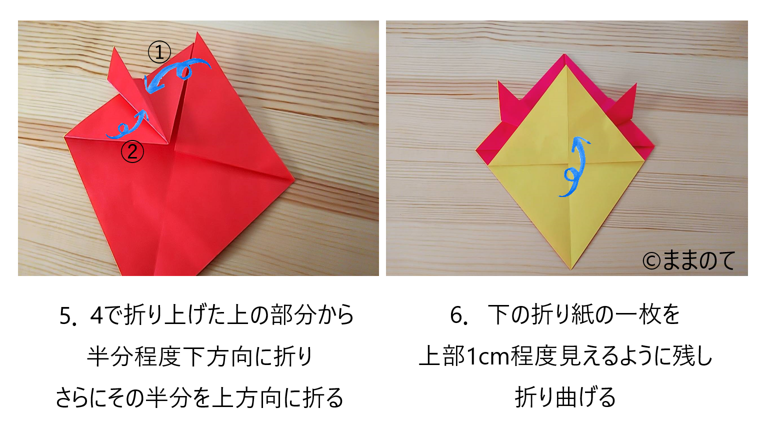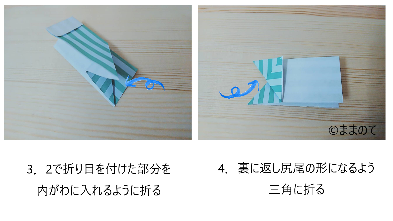 2.尻尾の部分を三角に折り下げ、折り目を付ける