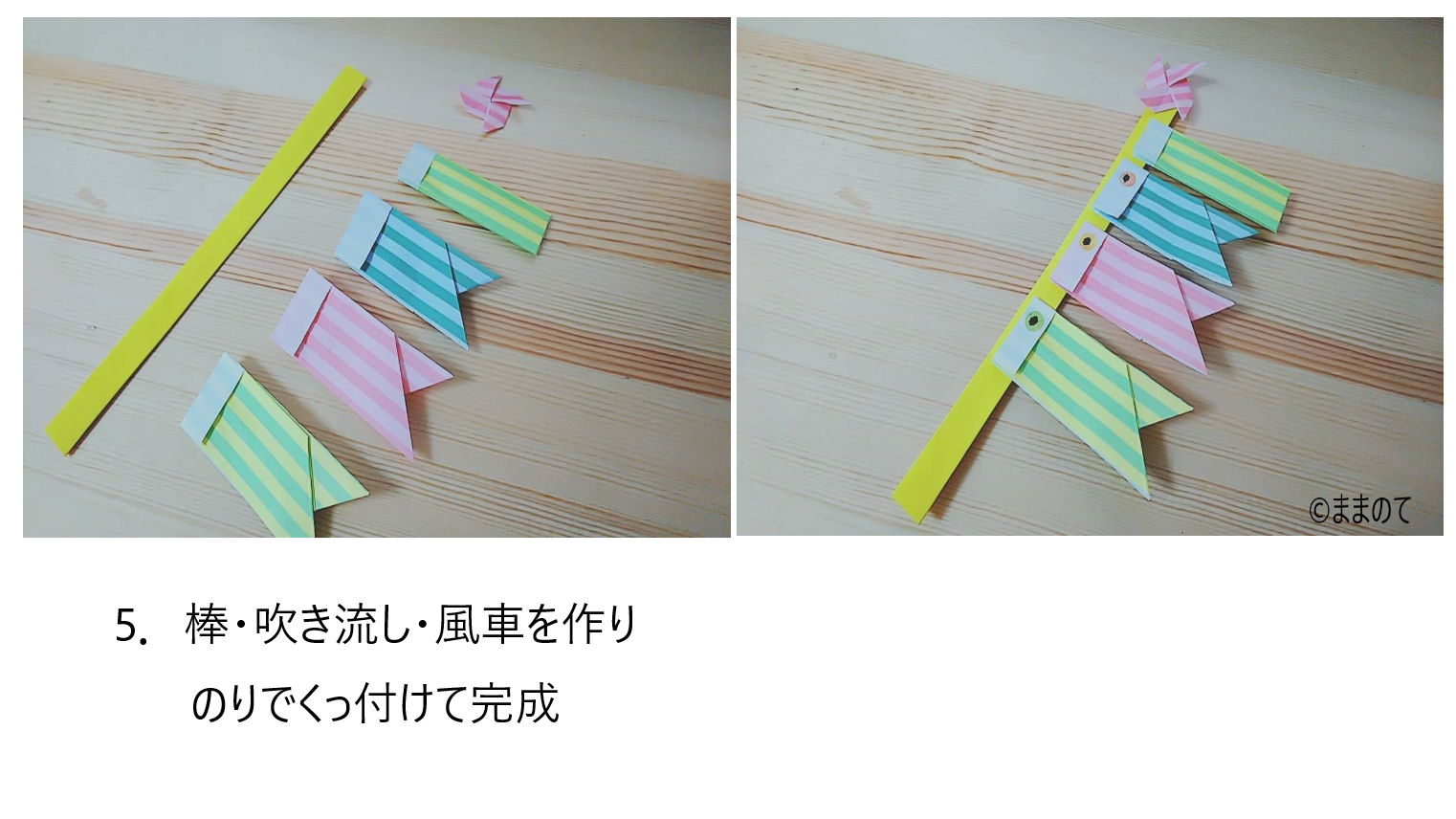 5.棒・吹き流し・風車を作り、のりでくっ付けて完成