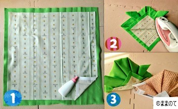 2.アイロンで折り目を付けながら、かぶとを折るようにフェルトを折る