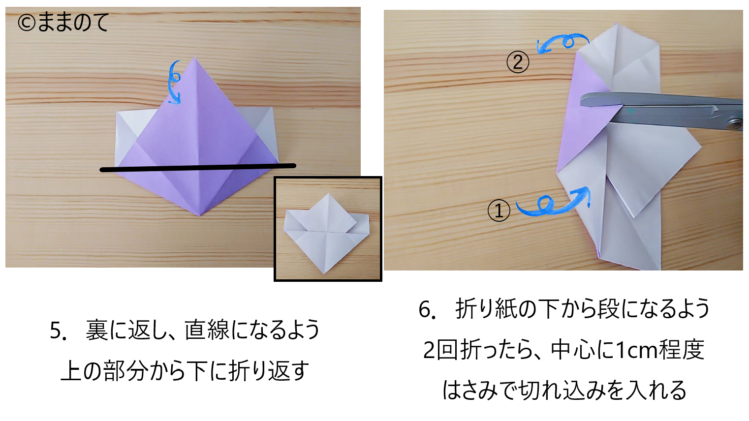 6.折り紙の下から段になるように2回折ったら、中心に1cm程度はさみで切れ込みを入れる