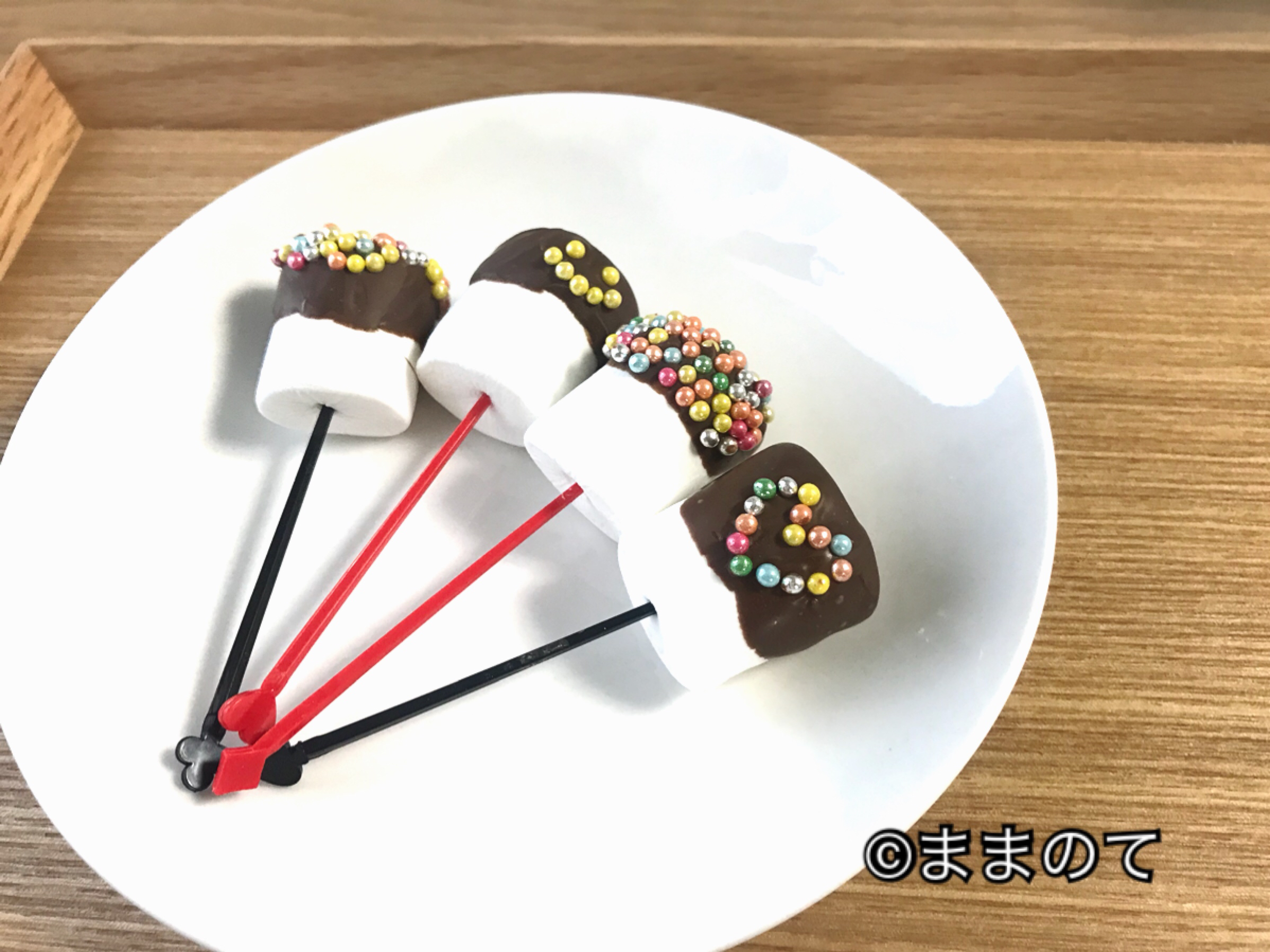 4.溶かしたチョコレートに、ピックに刺したマシュマロを浸す。