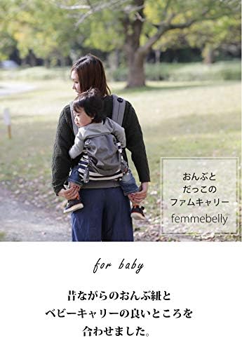 ファムキャリーは昔ながらのおんぶ紐とベルトタイプの抱っこ紐の特徴を兼ね備えた抱っこ紐です。シートには赤ちゃんの落下を防ぐおなかホルダーが付き、安全な状態で簡単におんぶができる設計になっています。