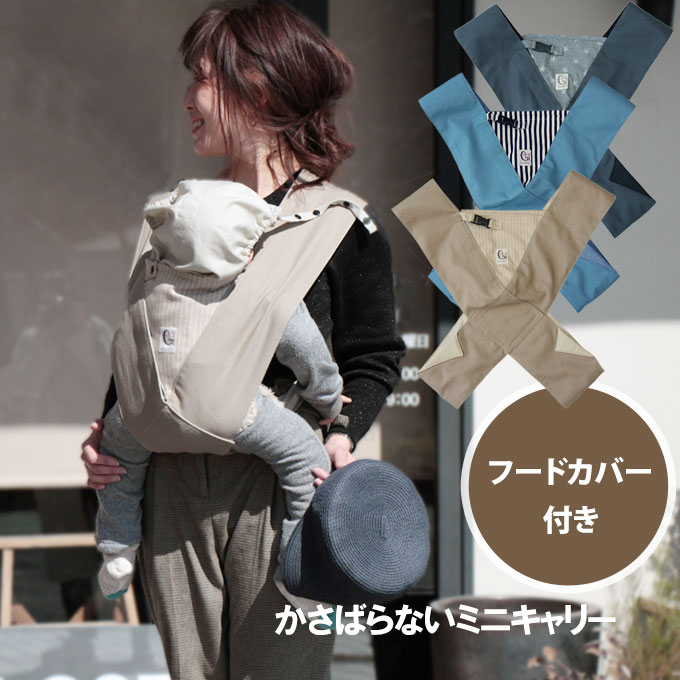 ファムキャリーミニは、見た目も使い勝手も本格的ながらコンパクトに持ち運べる便利なクロス抱っこ紐です。フードカバーが付いて、ぱっと見ただけではベルト型の抱っこ紐に見間違えるほど。