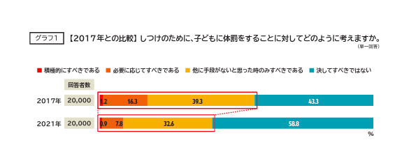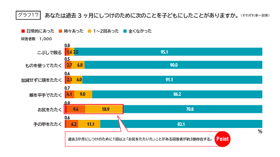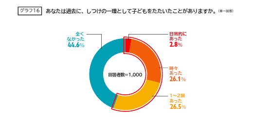一方で、日常的にたたいているという割合は2.8%と約1ポイント上昇しています。また「時々たたく」「1~2回たたいた」のはそれぞれ約26%という結果でした。