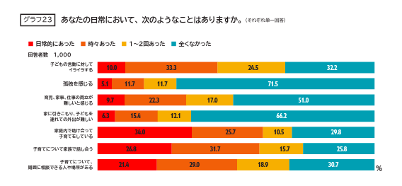 育児中心の生活は子どもに寄り添える喜びがある反面、自分のキャリアや家事との両立について不安に思うこともあるでしょう。このことは調査結果にもあらわれており、日常で「孤独」や「育児、家事、仕事の両立の難しさ」を感じているパパ・ママほど、たたく頻度が高いという傾向がみてとれます。