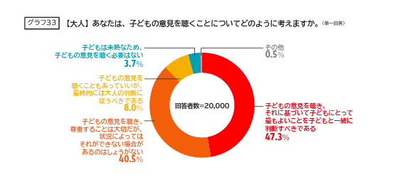 体罰でなければ、怒鳴る、にらむという行為は許されるものなのでしょうか。セーブ・ザ・チルドレンは今回の調査で、「子どもの意見を聞くこと」について、大人2万人および子ども344人に質問しています。
