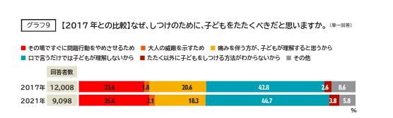 「口で言うだけでは子どもが理解しない」(44.7%)「すぐに問題行動をやめさせるため」(25.4%)「痛みを伴う方が子どもが理解する」(18.3%)というのがその主な理由でした。「たたく以外にしつける方法がわからない」(3.8%)という回答もありました。