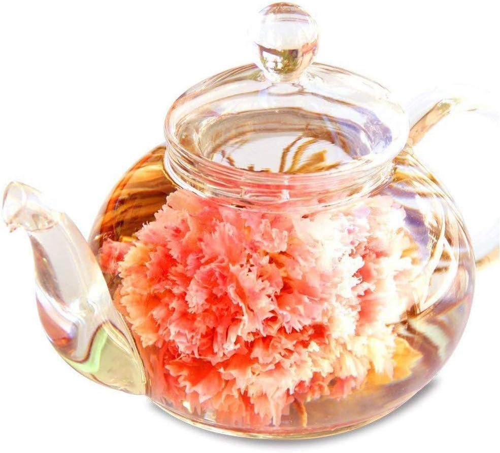 リムティーの「花咲く工芸茶」は、ポットに工芸茶を入れてお湯を注ぐことで、ふんわりと花が開いていくという、見た目も楽しめるお茶です。カーネーションをはじめ、キンセンカやマリーゴールドなど10種類のバリエーションが楽しめるのも嬉しいですね。
