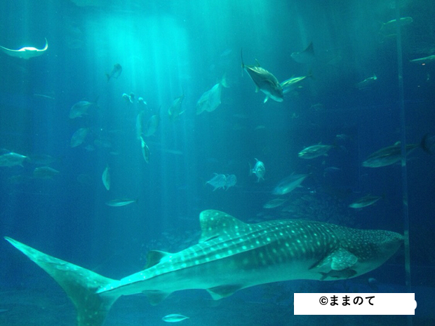 沖縄美ら海水族館では、巨大な水槽の中をゆらゆらと泳ぐサメやマンタなどが見られます。館内は涼しいので、子ども連れでも安心ですね。泳ぐ魚たちを見ながら食事ができるレストランがあり、沖縄気分を存分に味わえるでしょう。館内はスロープ完備で、ベビーカーは無料で借りられます。