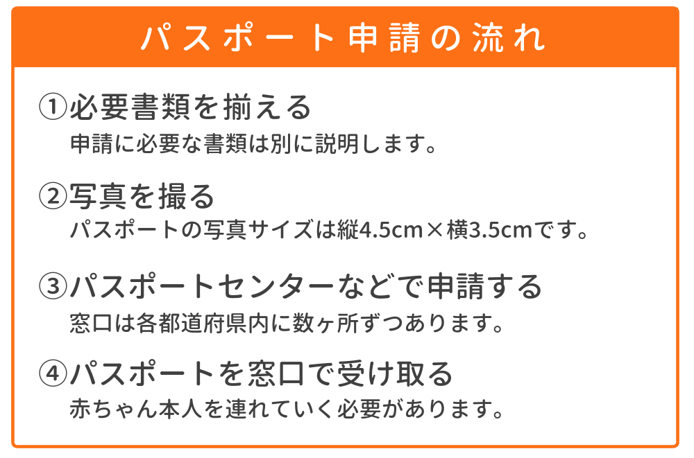 赤ちゃんのパスポート申請の大まかな流れは以下のとおりです。