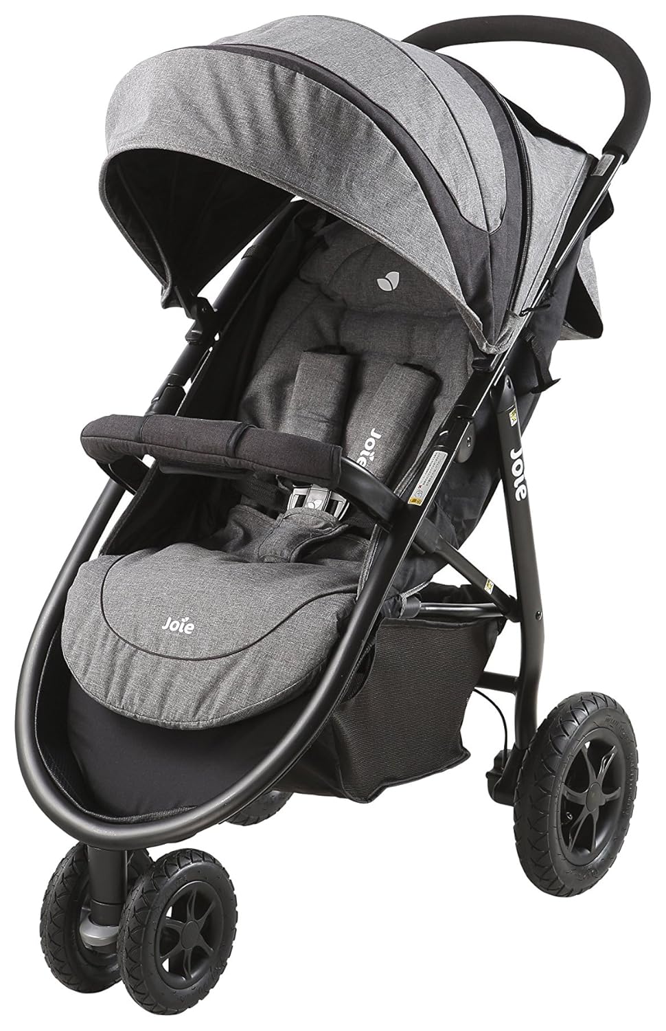 「ジョイー」の「ライトトラックスエア」は、操作性が高い3輪ベビーカーです。片手で簡単に折りたたむことができます。前輪のエアレスタイヤは、障害物に当たってもパンクする心配がありません。