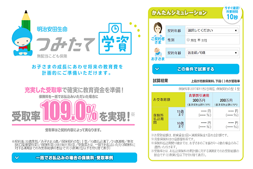 つみたて学資の公式サイトでは、契約者と子どもの年齢に合わせて保険料をシミュレーションすることができます。高額割引の返戻率も確認することができるので、試してみても良いですね。