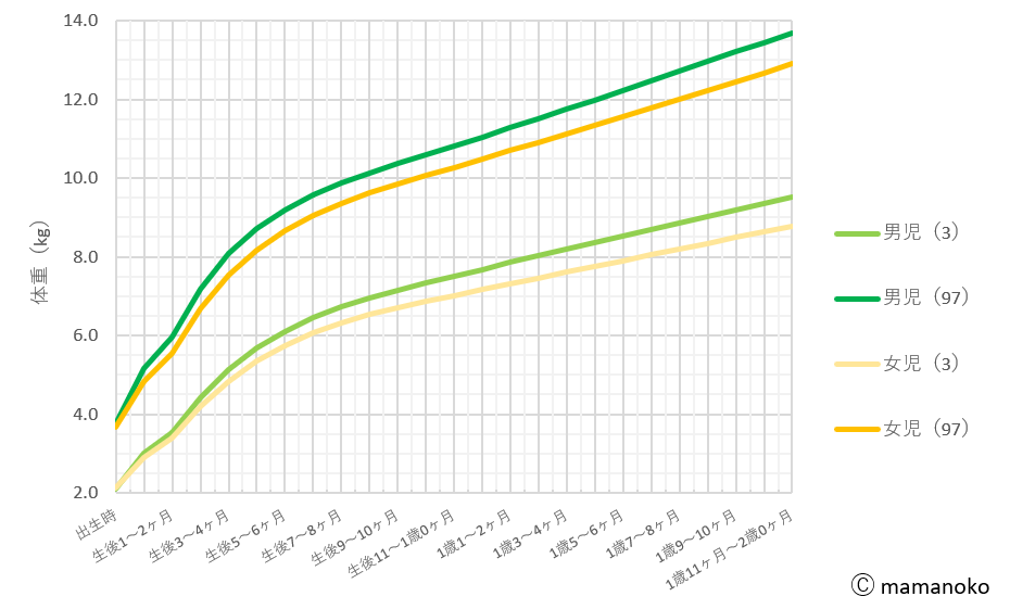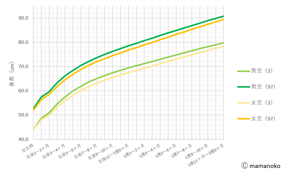 ここでは、男女別に見た成長曲線を紹介します。厚生労働省による成長曲線のグラフでは、満1歳までは月齢ごと、そこから満2歳までは2ヶ月ごと、それ以降は6ヶ月ごとのデータがとられています。