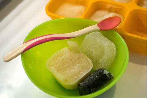 離乳食を冷凍するときは、一食分ずつ冷凍しておくと便利です。製氷皿を使えば一度に数回分の野菜スープを冷凍することができますよ。あら熱をとったあと、大さじ1くらいずつ製氷皿に入れて冷凍保存しておきましょう。