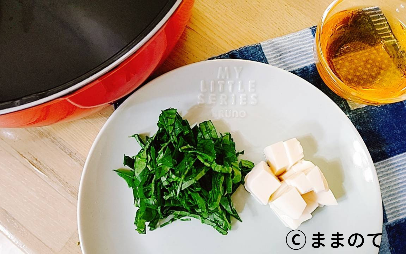 2.野菜スープを鍋に入れて火をつけ、小松菜と豆腐を入れてひと煮たちさせたら完成
