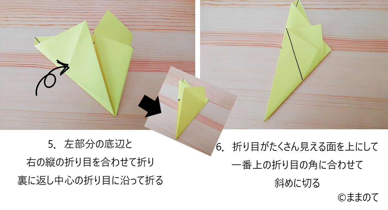 6.折り目がたくさん見える面を上にして、一番手前の折り目の角に合わせて斜めに切る