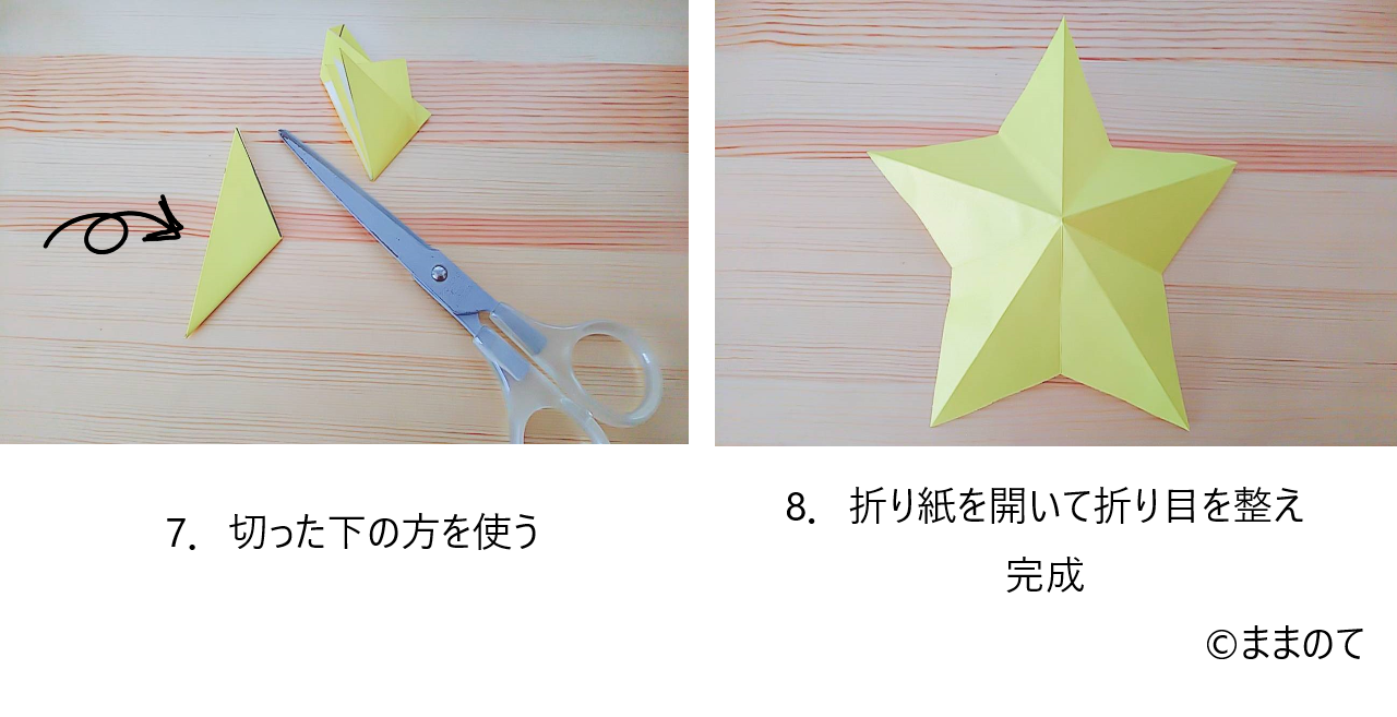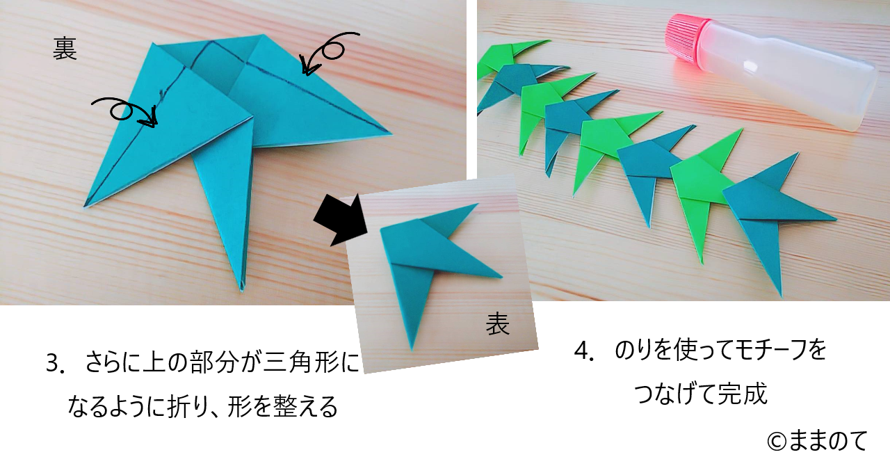 星を作る際は、のりを使用すると外れにくくて便利です。慣れてきたら折り紙を1/4に切って小さめの星を作っても良いでしょう。